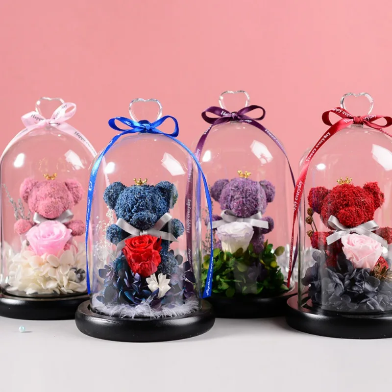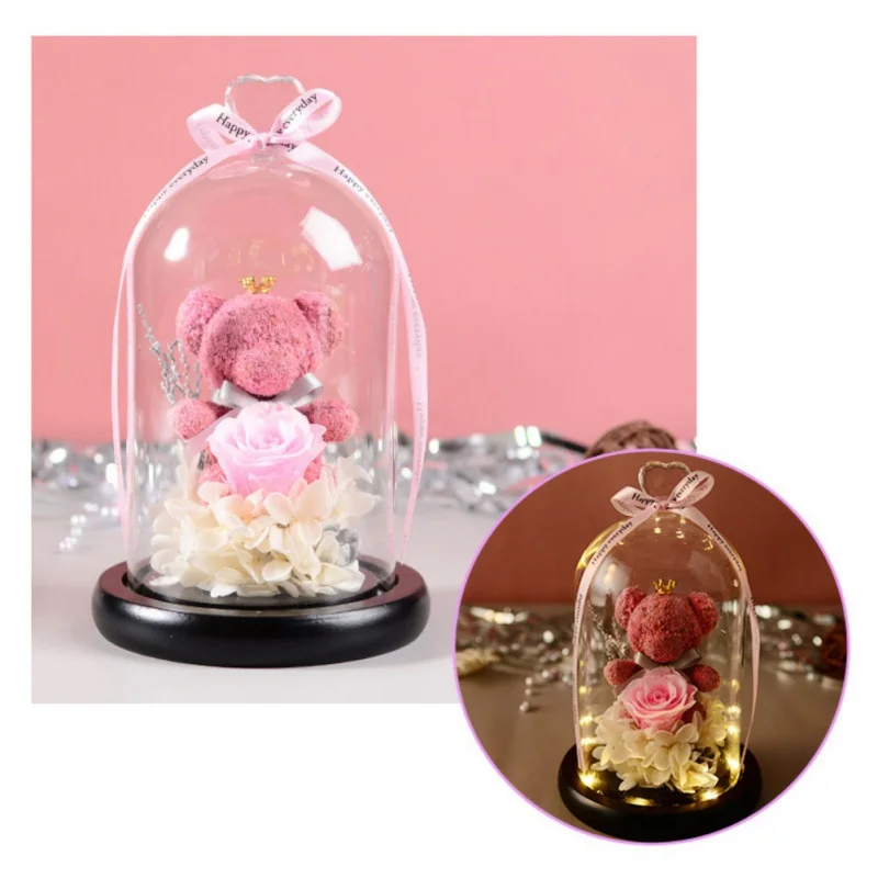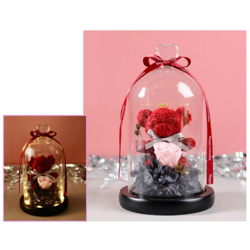 BEST QUALITY Eternal Teddy Bear Fresh Rose Flowers In Glass Dome With LED Light In A Flask Immortal Rose Valenti